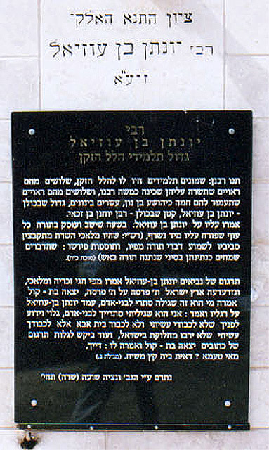 The memorial place of the G-dly Tana Rabbi Yonata ben Uziel The greatest (gadol) student of Rabbi Hillel HaZakein (the Elder) Our Rabbis teach us: Hillel HaZakein had eighty students. Thirty of them deserved that Moshe Rabeinu Shachina (Moshe Rabeinu's Holy Spirit), and thirty of them deserved that the sun would stand still for them like for Yoshua ben Nun (the event that took place before the walls came down in Jericho), and twenty of the Beinunim students, the greatest of them - Yohanatan ben Uziel, the smallest of them - Rabbi Yohanan ben Zachai. They said about Yohanatan ben Uziel that when learning Torah any bird that flew over him would ignite (Rashi: all the heavenly angels would gather around him to hear his Torah, TosFot comments: happy things like those given in Sinai like the giving of Torah in fire). Targum (translation) of prophets Yonatan ben Uzial they said from Hagi, Zecharia and Malachi and Eretz Yisroel was shocked 400 parsas (measurements) by 400 parsas, bat Kol (heavenly voice) came out and said who is the one revealing my secrets to mankind. Yonaton ben Uzial stood up on his feet and said "I am the one who revealed Your secrets to mankind knowingly in front of You not for my honor I did it and not for the honor of the house of my father but for Your honor I did it, for wouldn't be many machloket (disputes) in Israel". And also asked to reveal targum of Katuvim (writings of the Tanach / Bible) Bat Kol came out and said to him (Y ben U) "enough (mem tet ?) because its the time of end Moshiach" |